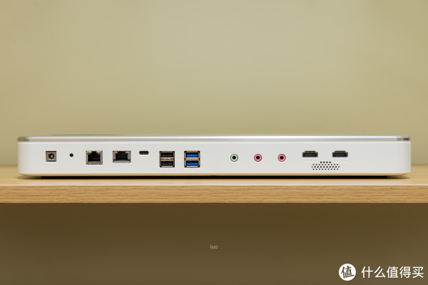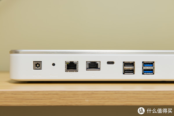 机器背面的接口,从左至右依次是电源输入、重置按钮、千兆网口、万兆网口、USB 3.0 Type-C接口、2个USB 2.0接口、2个USB 3.0接口。