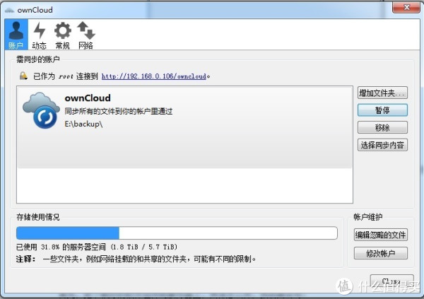 然后从网上下载owncloud的客户端,安装好,在账户里--》服务器地址中输入 http://你服务器的IP/owncloud就可以实现云盘功能了