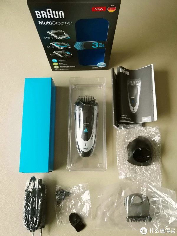 盒内全部内容:剃须刀本体+三种造型器附件+充电器+座充+清洁刷+说明书