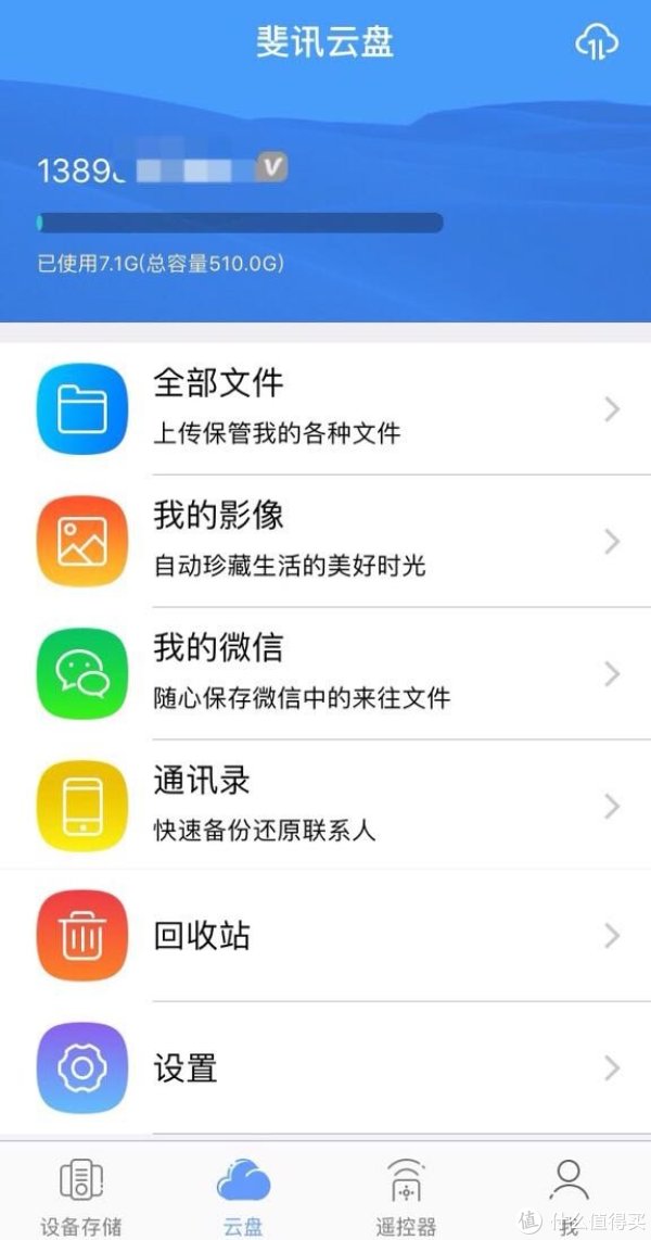 这是管理斐讯云盘的界面,斐讯允许第一年免费使用500G云盘,我已经上传了一些影片所以显示已使用7.1G,云盘还可以备份微信和通讯录