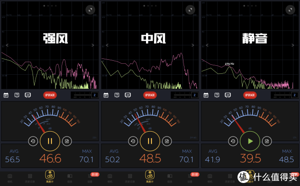 海信这台空调的静音风道采用了“不等距贯流风扇”,就是每片叶片之间的距离是不等的,经过这样特别设计的风轮在保证风量的情况下,还能够降低风噪,起到静音效果。如上面分贝计显示的,静音模式下,空调发出的声响已经淹没在房间的正常噪声中。