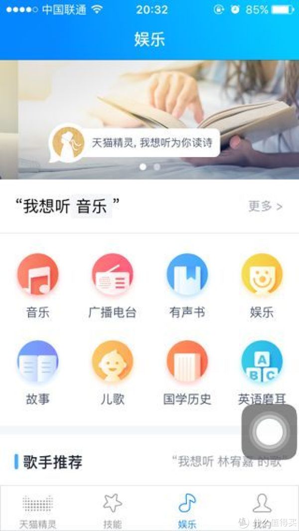 在APP的第二页,是技能学习页,上面可以学会各种天猫精灵的语音控制指令。感情把说明书变成APP了,够节俭的。