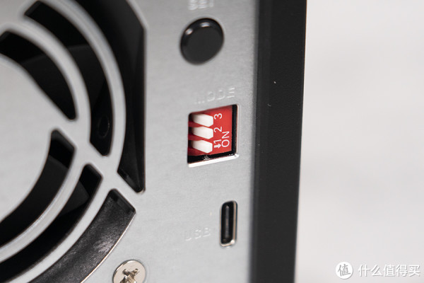 RAID模式切换这边单独说下,除了可以使用管理软件进行RAID组设定外,TR-002支持物理RAID组设定,通过机身背后的物理按键可以实现快速设定,多种模式可选,包括独立模式、JBOD、RAID 0、RAID 1。