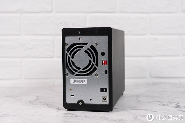 机身背面,散热风扇占据了绝大部分位置,左下方是锁孔,右侧从上往下依次是设置键、RAID模式切换键、USB Type-C接口、开关、电源接口。