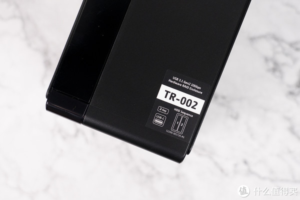 TR-002支持2块3.5英寸HDD,或2块2.5英寸HDD、SSD,因此机身尺寸控制的还是不错的,宽度比一块3.5英寸硬盘略窄,高度则略高于硬盘高度。