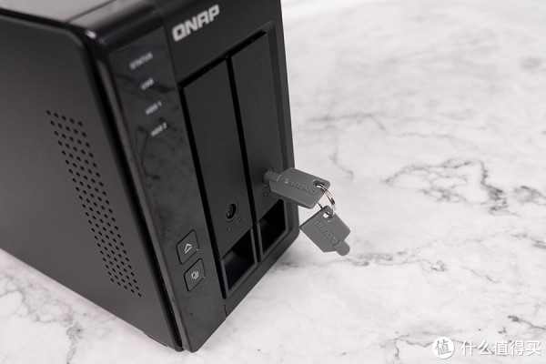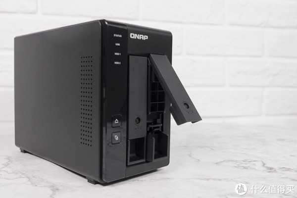 接下来看下机器主体,正面右侧是两个硬盘托架,左侧靠上是各种指示灯,左侧靠下是退出键和一键复制按键,需要说明的是,这个一键复制键仅在将TR-002作为QNAP NAS扩展时可用。