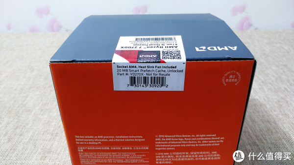 盒装的标识上依然是一些产品信息和序列号,这代2700X才参数上来说,对比前代变化最大的应该就是主频的提升,甚至超过了前辈1800X(1700X默认频率3.4G,动态加速3.8G;1800X默认3.6G,动态加速4.0G)。