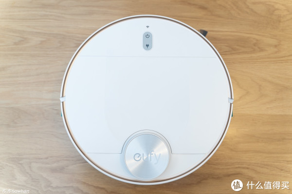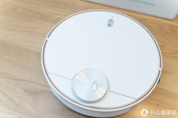 雷达转速传感器上面为银色的同心圆设计,eufy的LOGO放置在中间,颇具时尚感。
