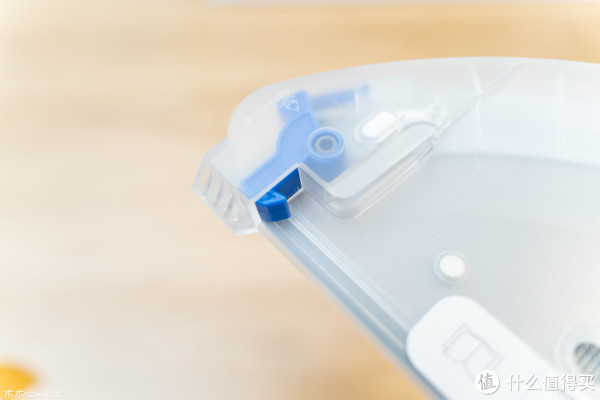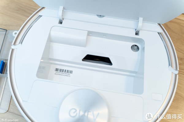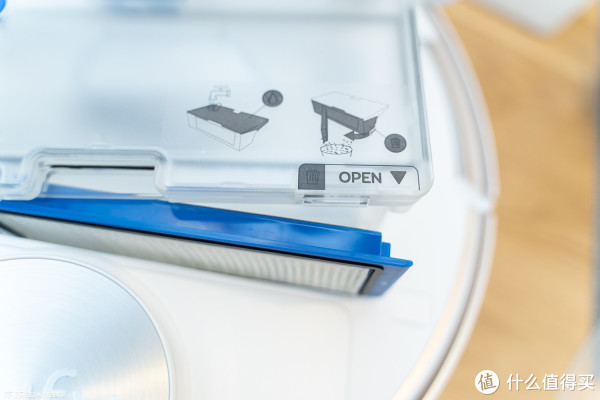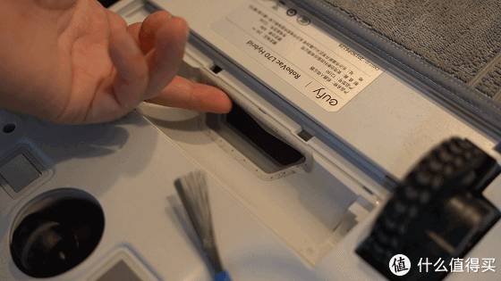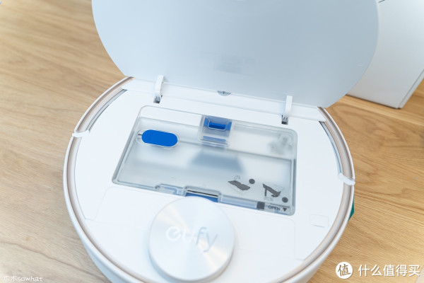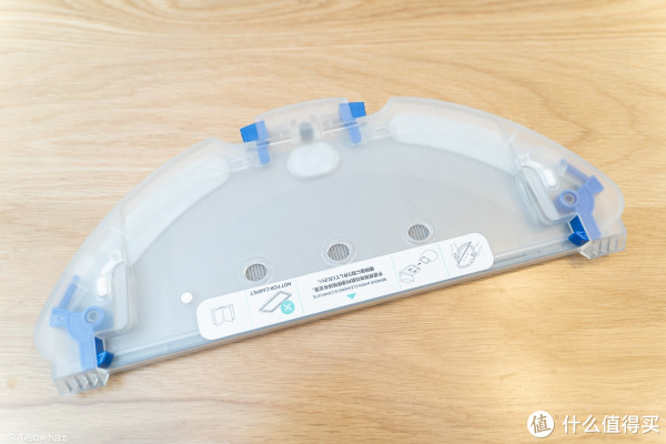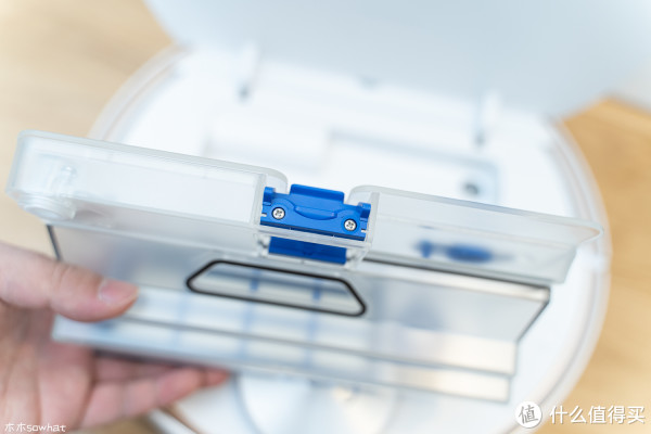 再来看扫地机内部,尘盒和水箱布置在一起,上面注水为水箱,下面则为尘盒。