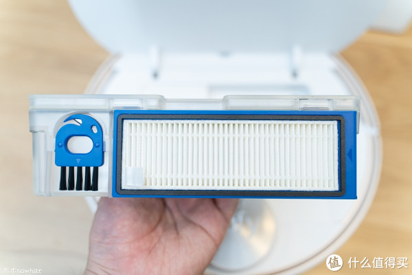 因为尘盒上有水箱,所以开启时要通过滤网这里打开,滤网边上则放置着清理用的小刷子,上面也有刀片。