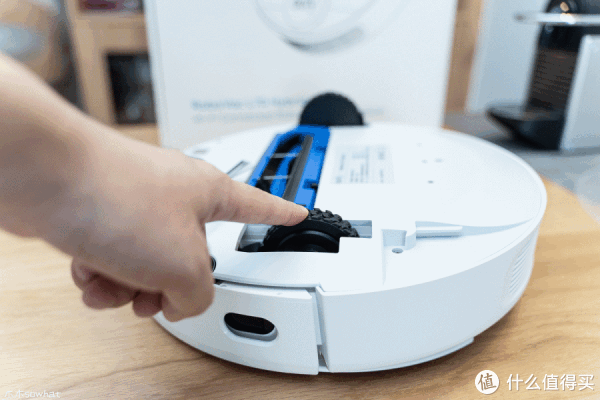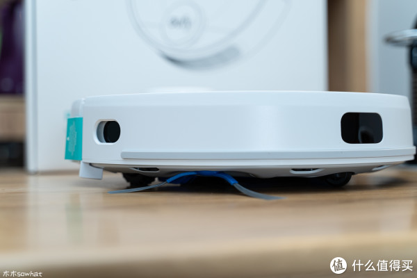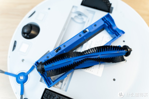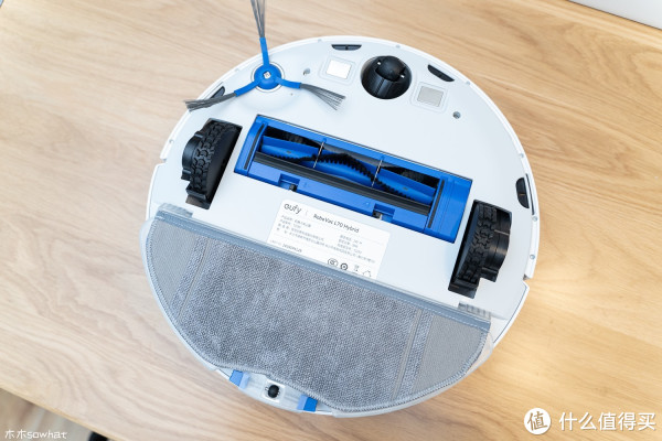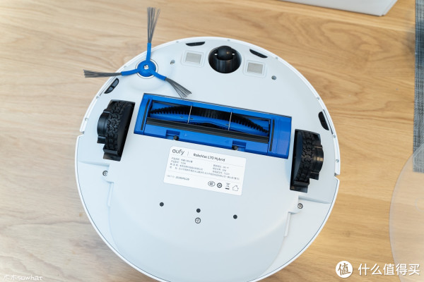 再来看扫地机底部,也是常规扫地机的部局,白色外观点缀着蓝色主刷及边刷,还挺好看的,上面边沿为四个悬崖传感器,左上角为边刷,中间为主刷,两边则为主轮。