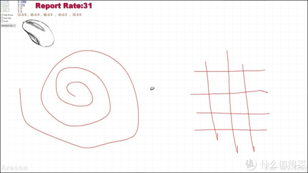 ▲Mousetest软件测试,笔者才有1600DPI,分别画了蚊香图和井字。蚊香图,连贯性还不错,只是有点点拖的感觉,然后笔者将鼠标速度增加了2档后,有所改善。井字,竖线正常,横线部分线段有点直线修正的现象。