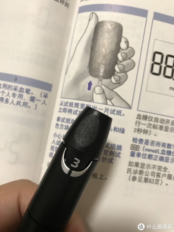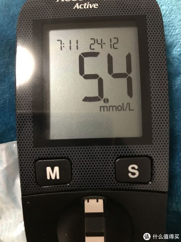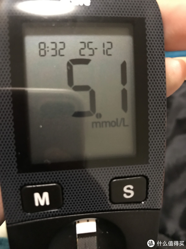 第一次测试的时候让老公来做了试验品,采到第二次才成功,前两次都是血量不足,后来发现在指腹处稍往采血针扎的孔处一挤,血就会很方便地出来一滴,量不大,正好合适。老公连续三天测试的早上空腹血糖都在5.3、5.4左右徘徊,还算比较稳定。和之前在医院的测试相差不大,觉得应该没问题,所以也没去进行校准了。