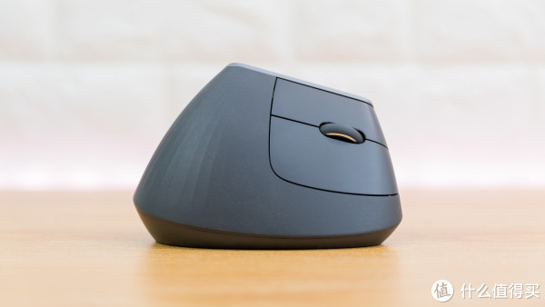 右测视角,罗技 MX Vertical 有点像一个伫立的河蚌,右上角设计着鼠标的左右键位和滚轮。侧面的手部贴合区域采用了橡胶材质,同时这里采用的是棱角分明的纹理,相比于光滑的弧面有助于提升质感,增大摩擦。