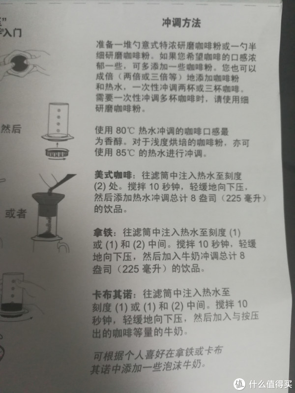 第四、这货的定位不明确。我已经说了这货是做不了意式咖啡的,但是说明书上居然赫然写着如何做拿铁和卡布奇诺。天呐。还尼玛一本正经地写到要如何加入牛奶。而且按照说明书的指导,一份的咖啡应该将水加到刻度“1”,如果这么做的话,那么咖啡和水的比例就接近1:1了,这确实 是 意式咖啡的完美比例。但是 我说这货的压力不够,而且还会他妈漏水,你如果真的这加这么一点水,还没等 咖啡粉浸润呢,水就全跑没了。同时粉勺的设计也是按照意式咖啡来的。一勺粉的重量大约是18g。一勺豆子的重量不到13g.