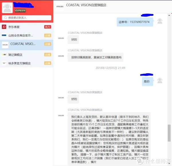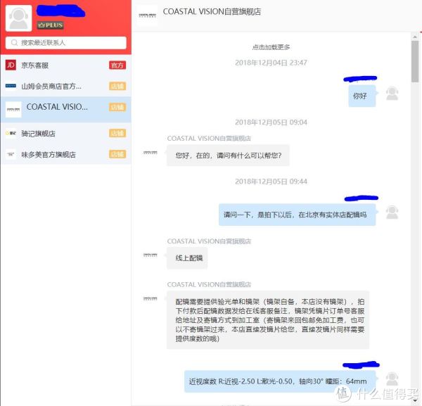 ,和客服沟通中,我第一次提供了现在眼镜的度数和瞳距,不过他可能没有细看,以为我没有发右眼的,我的验光数据是自己记录的,也担心有点不准,于是试着提出按老眼镜配是否合适。如下是和客服沟通的全部内容: