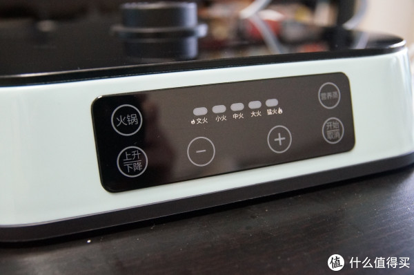 操作面板设计比较简洁,也带有指示灯功能。除了火锅功能外也可以进行蒸煮操作。通过上升下降按键可以轻松实现火锅的升降功能,实现类似海底捞的方便功能。5段式火力调节,轻松又精准的进行火力控制。