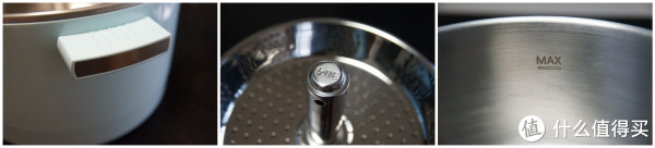 内层升降装置上可以看到明显的304不锈钢标志,同时锅子内部也可以看到MAX标记,需要注意的就是使用时不能超过MAX的限高线。