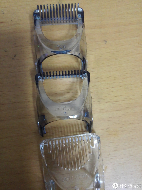 从上到下:第一个嵌套头可把毛发剃至8mm,第二个则可至3mm,最后一个是针对敏感部位,防止疼痛用的嵌套头。实测直接用机器剃腹部的毛,没有啥疼痛感。