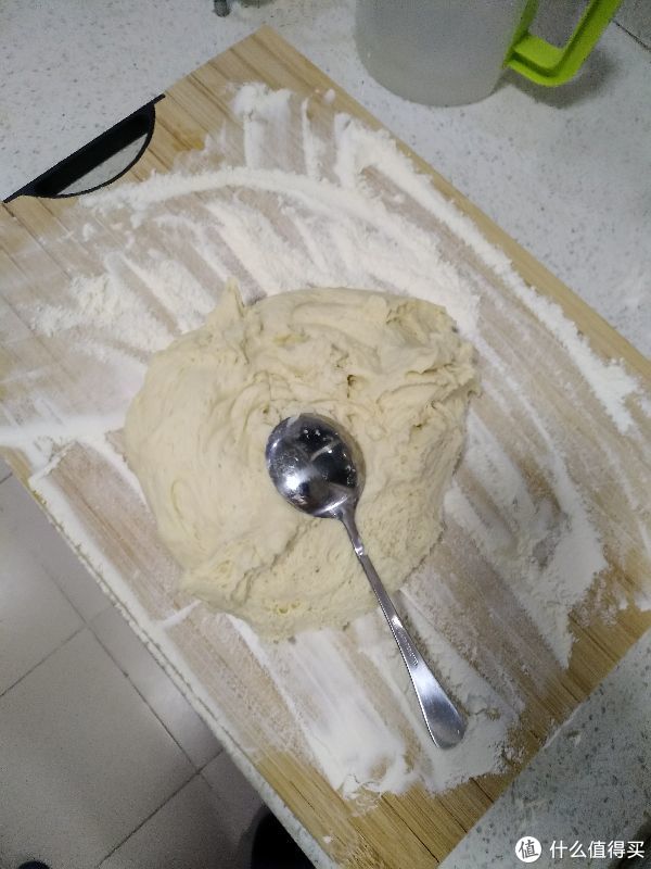 面班上撒好面粉用勺子把面团从盆里弄出来(不建议用手因为面团很黏沾到手上很难弄下来)