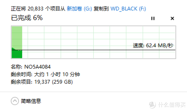 在遇到像是数量较大、单个文件较小的照片类型文件备份的时候速度会掉到60MB/s左右。当然也要考虑读写的另一块硬盘速度的影响。