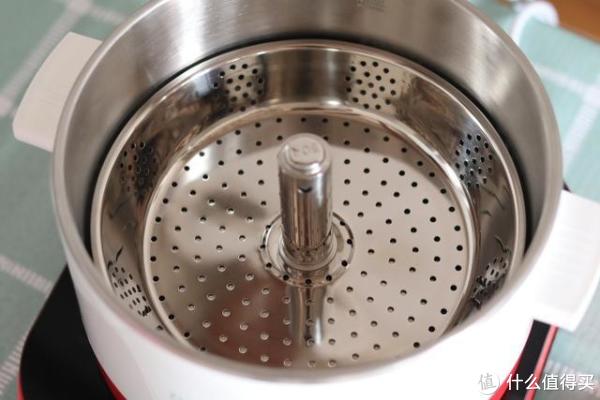 打开臻米智能升降火锅的锅盖可以看到里面还有一个不锈钢蒸台,该蒸台就是用来盛放食物的。臻米智能升降火锅的容量为2.5L,官方宣传可以满足3-4个人使用,不过实际使用中3个人勉强可以,4个人感觉太小了,锅内的食物有点供不应求。(可能我们都是吃货吧)
