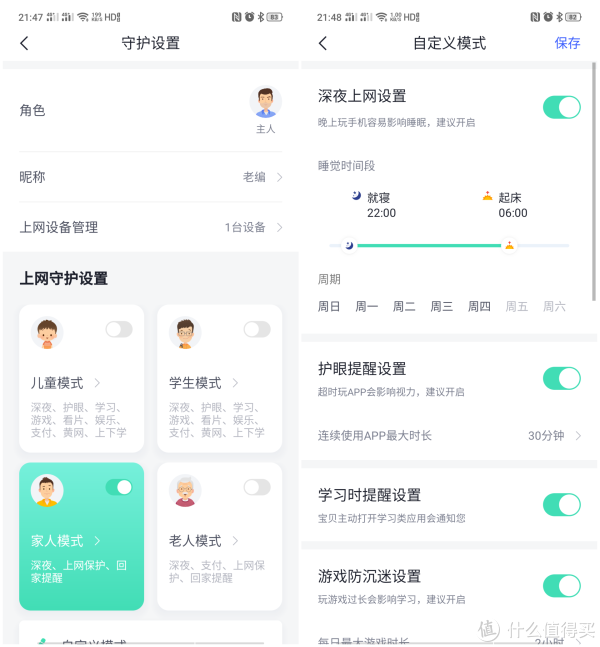 在面对众多联网手机、平板和电脑时,360家庭防火墙能够对每一台设备进行身份配备,并针对每一种身份内置了一种上网保护机制,例如可以将小孩子的手机设置为“学生模式”,那么我们可以对其上网时段、玩游戏的总时长、看视频的时长、甚至是在有支付行为发生时主人直接会收到提醒。小孩打开学习应用时也可以通知主人手机,其中老编认为最好的则是“欢迎回家模式”,可以为家人设置回家提醒,孩子未按时回家则会有有警告提醒。