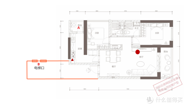 测试环境:依旧是我的80平小家,但是测试点则是小生活阳台(A点)和经过一段走廊的电梯口(B点)。电梯口距离入户门约6米左右,但是中间隔有多层墙,从而导致客厅路由信号没法很好的传输到这里。