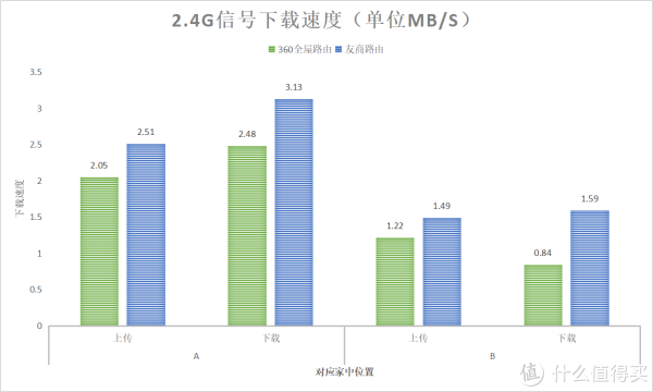 首先将母路由器放在红心位置,不接子路由,作为对比还找了一款友商的路由参与对比测试(价格在400元左右,以免被说是黑文就不写品牌了),分别测试A点和B点的信号和下载速度。