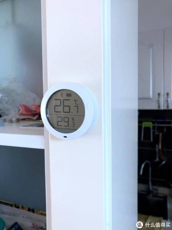 我最终将温湿度计挂在了厨房门前,这里最常去,进出时正好可以查看屋内温湿度显示。