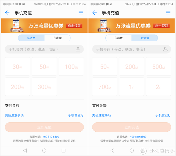 ▼"手机充值"子页面,没啥好说的,可以选择充话费还是充流量。