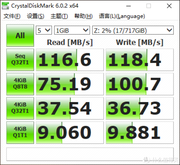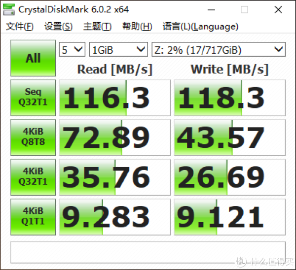 配置完成后,这里使用CrystalDiskMark6_0_2分别测试了有无SSD缓存加速的读写速率。