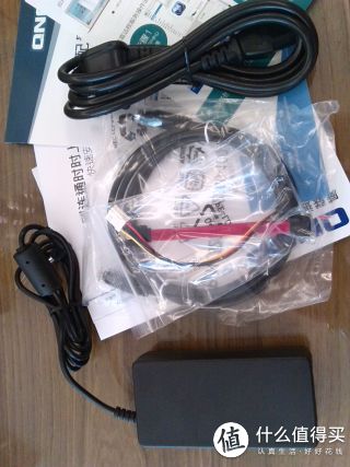 配件合影:电源线、电源转换器、黑色塑料袋里的是网线,至于是超五类还是六类就不知道了,另外还有一条短的SATA线(红色)和硬盘电源线,用来到时候安装第二块硬盘用(领导没批,而且现在存照片是电脑和NAS各一份,也够用了)。
