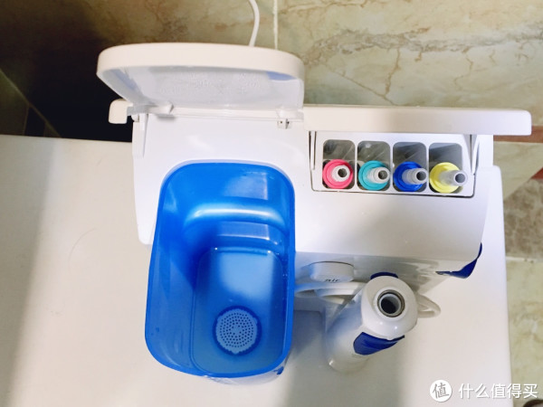 水箱盖是一体的,右边是储存槽。附赠四个喷头,有不同色环,方便一家人一起用不拿错(不过我男票个色弱分不清蓝绿,sigh)
