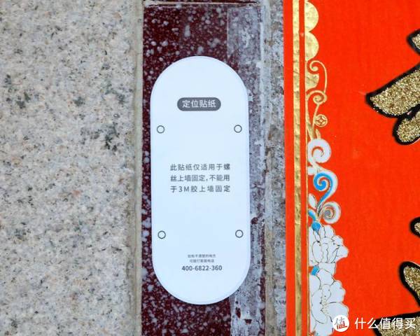 在安装360智能门铃时,有两种不一样的方式,分别是3M粘贴式和膨胀螺丝。在安装的时候可以根据自己的实际情况来选择,就拿我来说就是直接使用3M粘贴式,只要直接粘好背壳就可以了。如果是采用膨胀螺丝式就要像下图一样,先粘好定位贴,再打上膨胀螺丝也可以了。无论采用哪一个方法其牢固度都是相当不错的。