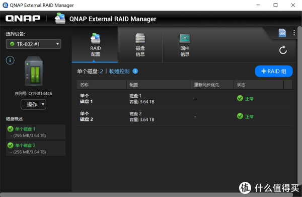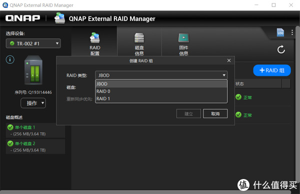 前面提到TR-002支持硬件和软件两种组RAID的方式,这里使用QNAP External RAID Manager软件进行RAID组构建。TR-002有两块硬盘,支持JBOD、RAID 0、RAID 1三种模式,这里我们组RAID 0模式。