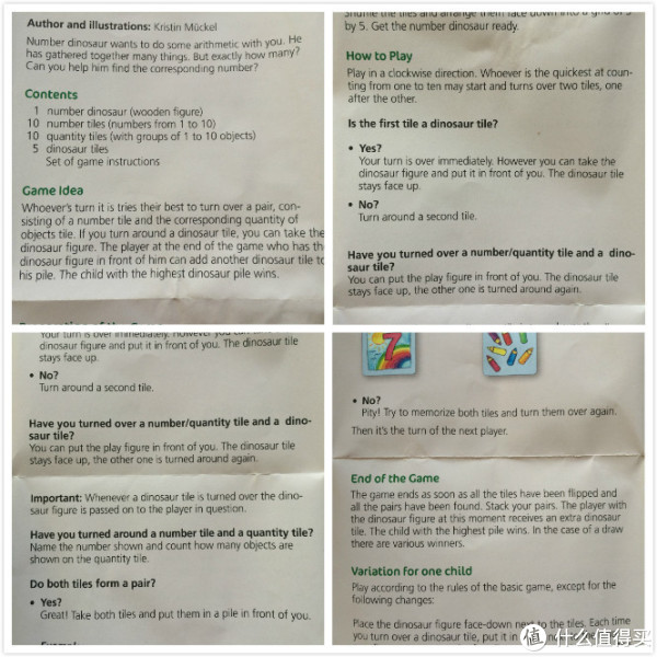 跟第一个一样,也是一个说明书,反正面共6种语言:德、英、法、荷、西、意。1个恐龙和25张卡片:分别是1-10的数字和物品,以及5个恐龙头像图片。