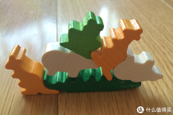 根据规则轮流掷骰子叠动物,动物全部叠完后,谁叠的多,谁赢。放一个叠起来的示意图。