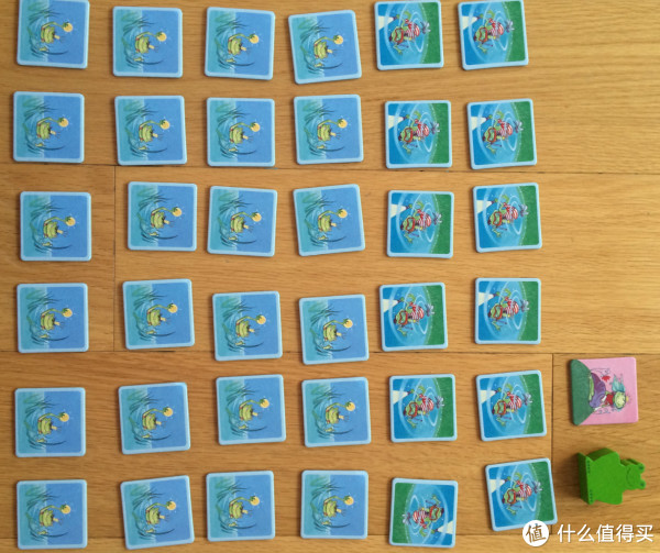 盒子里面有仍然是有一个反正面共6种语言的说明书。这个游戏比数字恐龙确实难了许多,因为牌的数量本身也多了,37张牌和1个青蛙。牌面上1个青蛙公主、12个潜水青蛙、24个手拿金球的青蛙。游戏时,除青蛙公主外,其他的按照6*6乱序、背面排列。玩家根据规则,凭记忆翻到的金球青蛙谁最多,谁赢。
