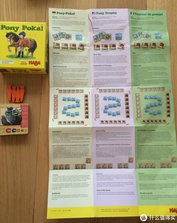 5.第五个是小马快跑,也是一个记忆力游戏。推荐等级:3颗星。牌比较多,也是稍微难一些,2-4个玩家可以玩,4-99岁的适用年龄。36张牌,4个胡萝卜。配置什么的是一样的,也是6国语言的说明书。不过这个我不怎么推荐的,后面会说到原因。