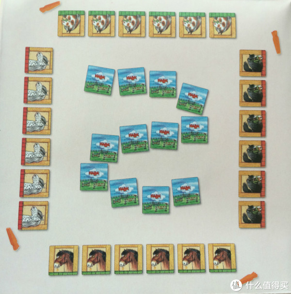36张牌是4种马,按照正方形排列,按规则凭记忆玩游戏。游戏时牌是这样排列的:
