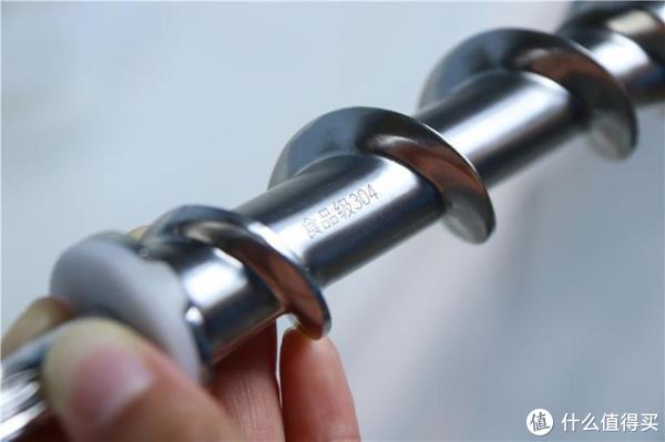 取下摸头,304不锈钢材质螺杆就可以抽出来了,上面清晰标有食品级304的字样,模头上面同样也有标注。可见这款面条机在材质方面用料还是非常扎实的。