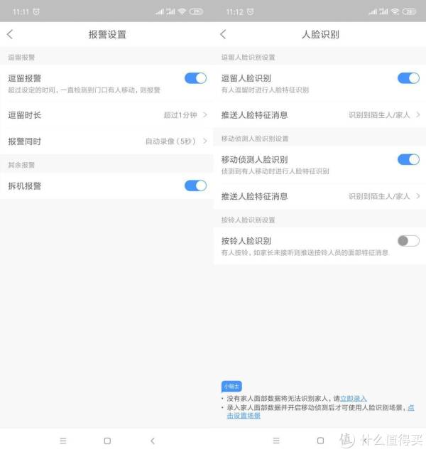 逗留报警和移动侦测都可以通过手机APP进行设置,开启逗留报警、拆机报警、移动侦测人脸识别等功能。
