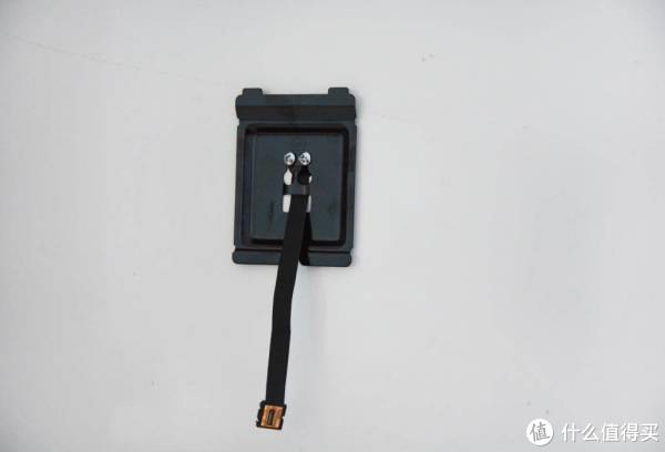 步骤三:先将门外子机背面的双面胶撕开,穿过排线,固定门外子机的位置。放置钢片支架,拧紧螺丝。