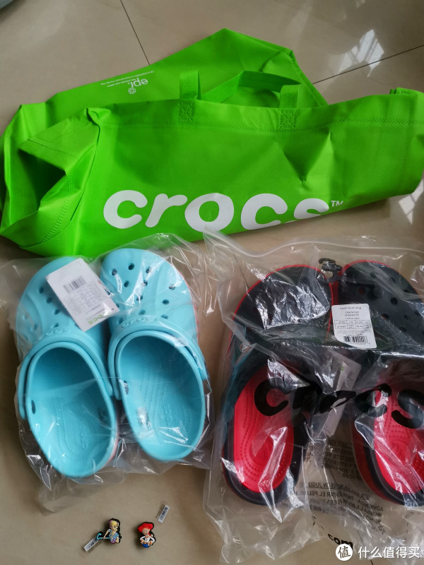 两双鞋和凑单的鞋扣,以及Crocs的购物袋
