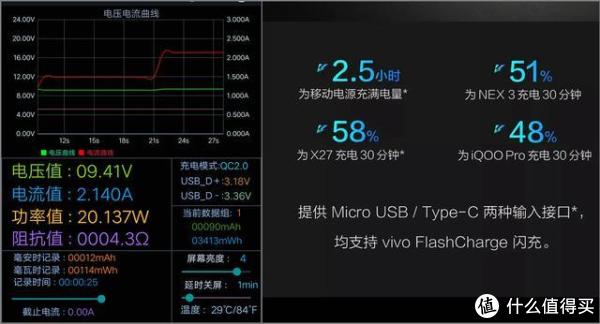 输出方面,官方给出的数据是给NEX 3充电30分钟能够达到51%,为iQOO Pro充电30分钟能够充到48%,我们实测给手机NEX 3充电电压值为9.41V,电流为2.14A,其充电功率为20W左右,除去测试设备的影响,该数值与官方标称22.5W是相符合的。