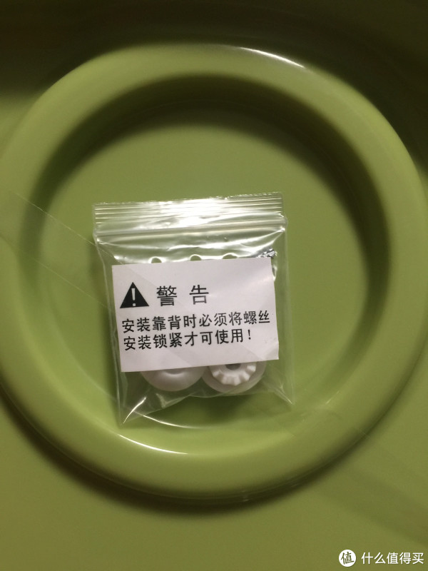 安装靠背需要用到的两个特制螺丝在绿色餐盘的杯托上塑封着。
