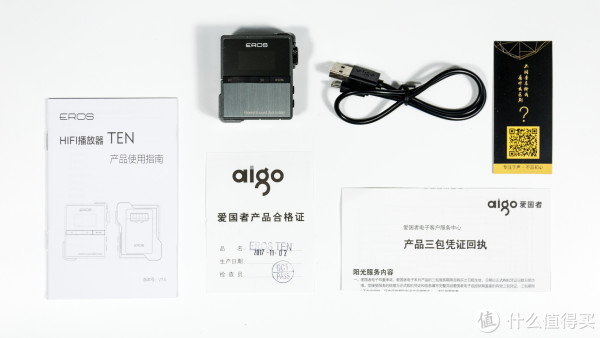 全部开箱之后,可以看到下面的全家福,除了播放器主体之外,还标配了数据线、产品使用指南、合格证以及三包凭证,非常传统,个人还是比较喜欢合在一张纸上。