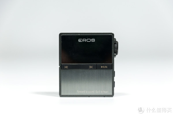 Eros Ten HiFi播放器整体为一个正方形的播放器,体积就和火柴盒大小无异,非常小巧。正面顶部是一0.96英寸的小屏幕,下方是一个金属拉丝面板,质感还是不错的。