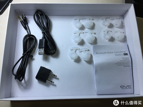 配件包含:一个USB转MicroUSB充电线,MicroUSB转3.5MM公对公转接线(用来把无线变有线),飞机耳机插头,大中小各两套硅胶耳机套,说明书。